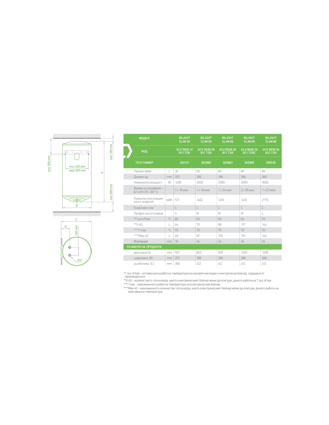 Бойлер Tesy BiLight GCV 5038 20 B11 TSR е с обем 50 литра и е предназначен за вертикален монтаж. Номиналната му мощност е 2000W, а диаметърът 38 см. Водосъдържателят е със стъклокерамично покритие. По-висока енергийна ефективност е постигната благодарение на премахнатата термовръзката между водосъдържателя и монтажната планка. Този бойлер Tesy има два работни режима, визуализирани с промяна на цвета на светлинния индикатор: режим Затопляне и режим Готов за употреба. Моделът има влагоизолиран ключ.