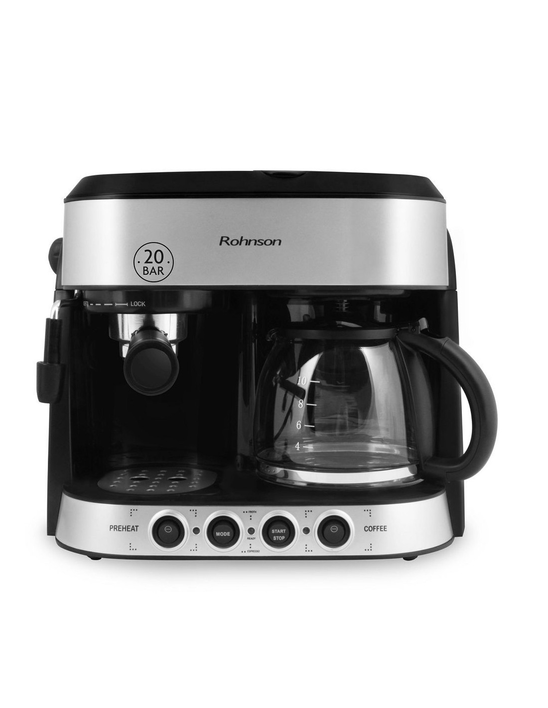 Комбинирана кафемашина за еспресо, капучино и шварц кафе . Мощност 1850 W . Елегантен метален дизайн . 20 бара налягане на помпата . Подвижен резервоар с капацитет 1,25 л . Защита от прегряване и свръхналягане . Автоматично изключване след 40 минути . Подвижни части за лесно почистване . Специален филтър за перфектен каймак . Пянообразувател за капучино с високо налягане . Незалепваща плоча за затопляне . Антикапкова система . Лесни за управление бутони . Светлинен индикатор