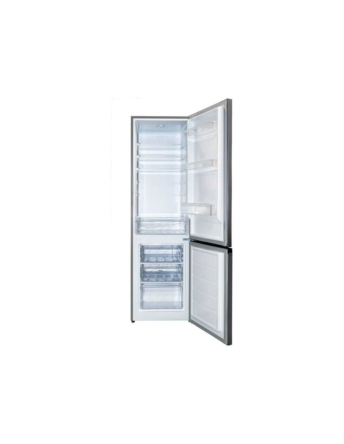 Общ обем 262 л . Обем хладилник 191 л . Обем фризер 71 л . Отделение за плодове . LED осветление . Годишна консумация 210 kWh . Енергиен клас E . Ниво на шум 40 dB . 3 стъклени полици . 3 фризерни чекмеджета . Размери (ВхШхД): 180 х 55 х 56 см . Цвят Инокс