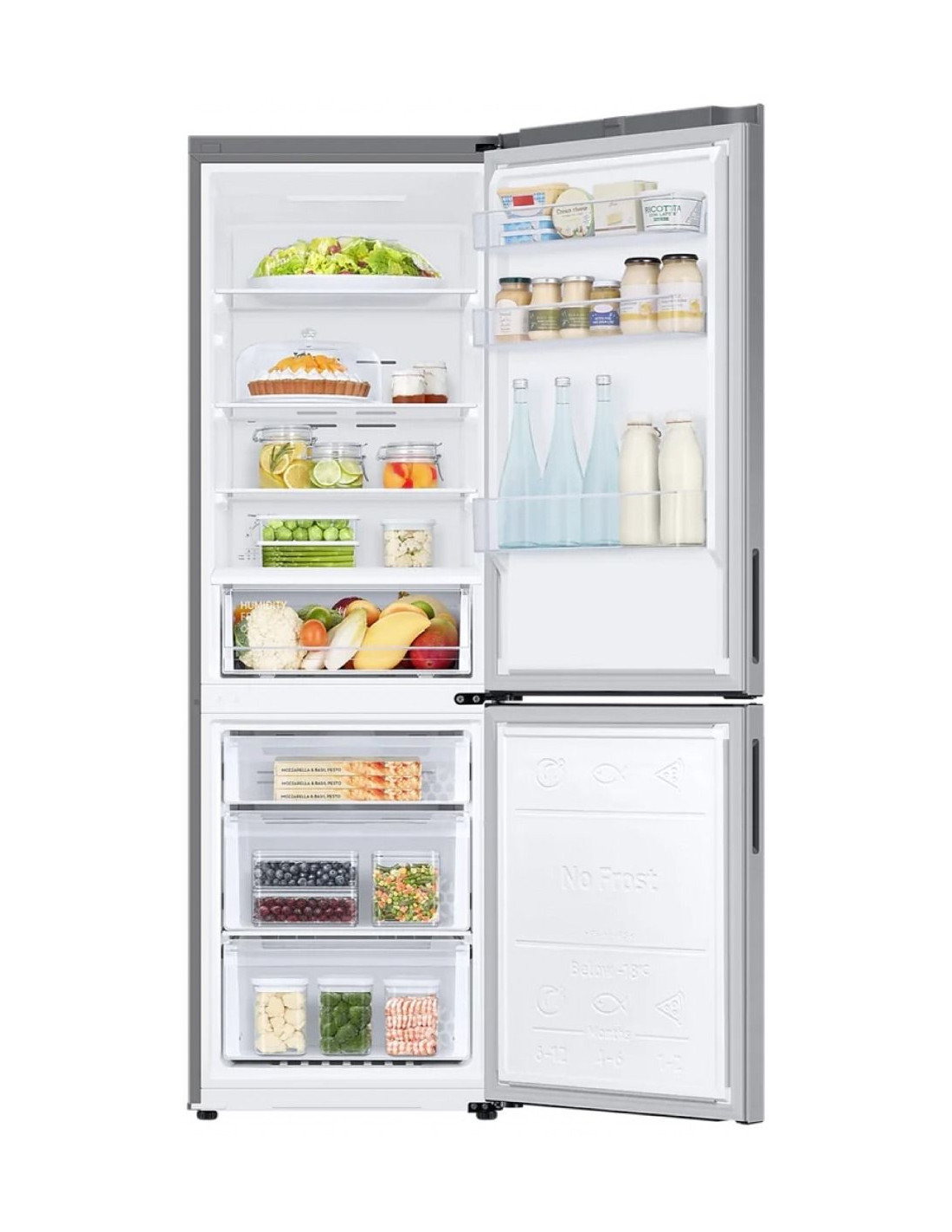 Система на охлаждане Total No Frost . Енергиен клас E . Общ обем 344л . Обем на хладилната част 230 л . 4 стъклени полици . 1 отделение за зеленчуци . Обем на фризерната част 114 л . Фризер с 3 чекмеджета . Ниво на шум 35 dB . Годишен разход 254 kWh . Размери (ВхШхД): 185.3 x 59.5 x 65.8 см . Цвят Инокс . Инверторен компресор с 10 години гаранция