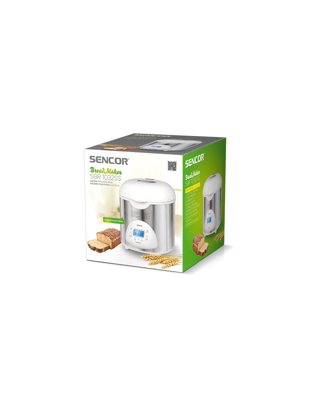 12 програми . Тегло на хляба: 450/700/900 гр. . Консумирана мощност 480-580W . 2 нива на печене (светло / тъмно) . Програма Fast - 90 минути. . 1 нож за месене . 10-часов таймер . LCD дисплей . Капак с прозорец . Поддържа на температура 60 мин. . Корпус от неръждаема стомана . Размери (ШхДхВ): 27.6 х 28 х 32см