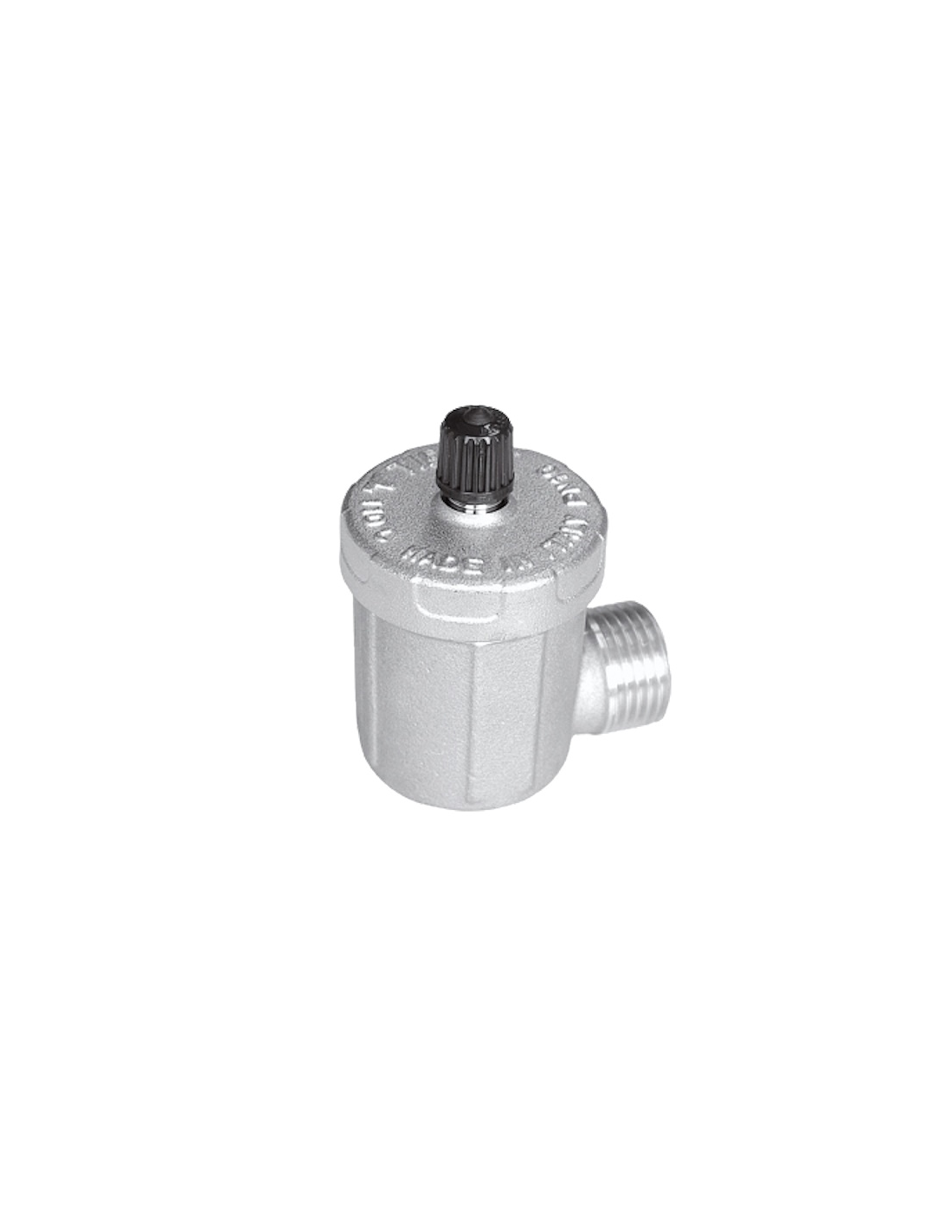 Автоматичен обезвъздушител за отоплителни и санитарни инсталации, изработен от никелиран месинг CW617 съгласно EN 12165 с външна резба съгласно UNI IS0 228. Механизъм проектиран, така че да предпазва контакта между замърсяванията на повърхността на флуида и затварящия механизъм, особено при стартиране на помпата. Поплавък изработен от полипропилен, затвор изработен от EPDM. Максимална работна температура 110°C, максимално работно налягане 10 bar. Максимално въздушно налягане 4 bar.