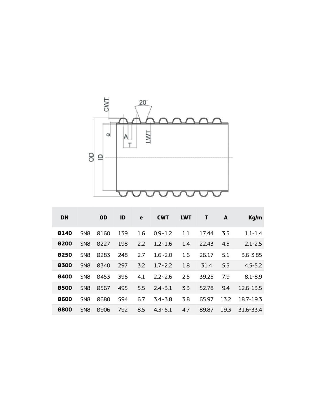 Тръбите стандартно са с дължина 6м., като в цената им е включена и муфа за свързване. PP двуслойните канални гофрирани тръби са предназначени за изграждане на извънсградни и промишлени канализационни системи за отпадни и дъждовни води с повърхностно натоварване на тръбите SN8.