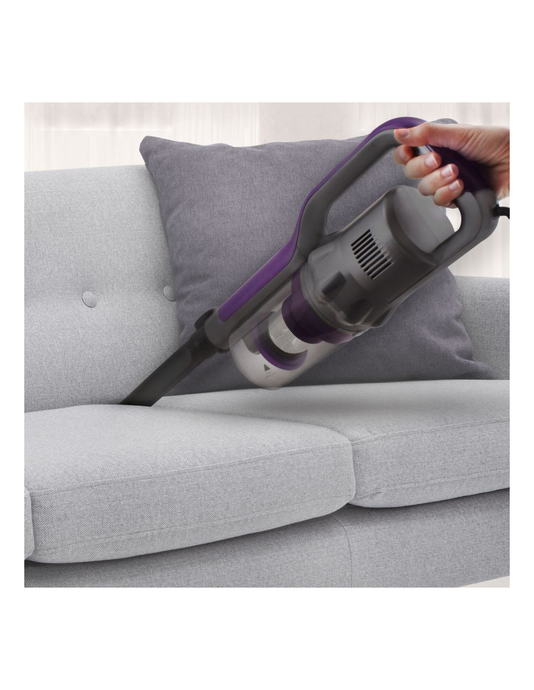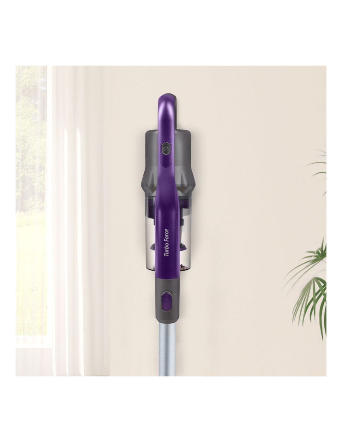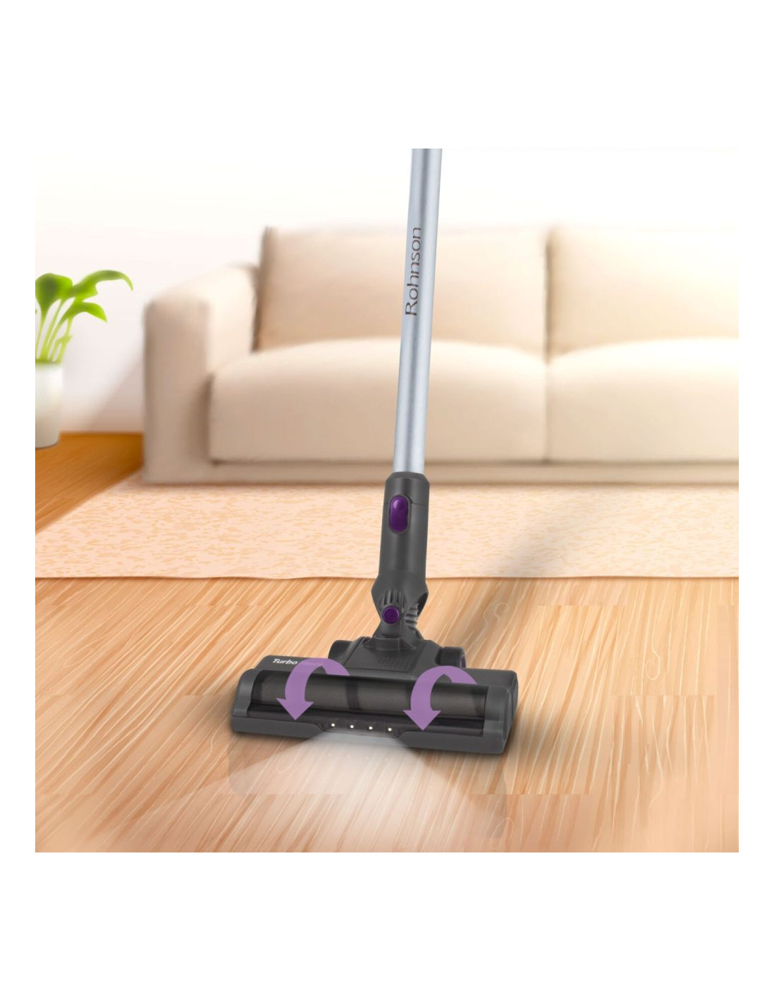 Ръчна пълноразмерна прахосмукачка 2 в 1 . Подходяща за всички видове килими, подове и повърхности . Моторизирана четка с LED светлина за по-ефективно и лесно почистване . Мощен мотор за висока всмукателна мощност . 0,6 л контейнер за прах . HEPA филтър . Ергономична дръжка . Лесна за разглобяване, за по-компактно съхранение . Хигиенично и бързо изпразване на контейнера за прах . 6 м захранващ кабел- 7м радиус . Аксесоари: турбо четка, 2 ролки за килими и под, накрайник за ъгли, 2 в 1 четка , докинг станция за зареждане . Ниво на шума 78 Db . Moщност 700 W