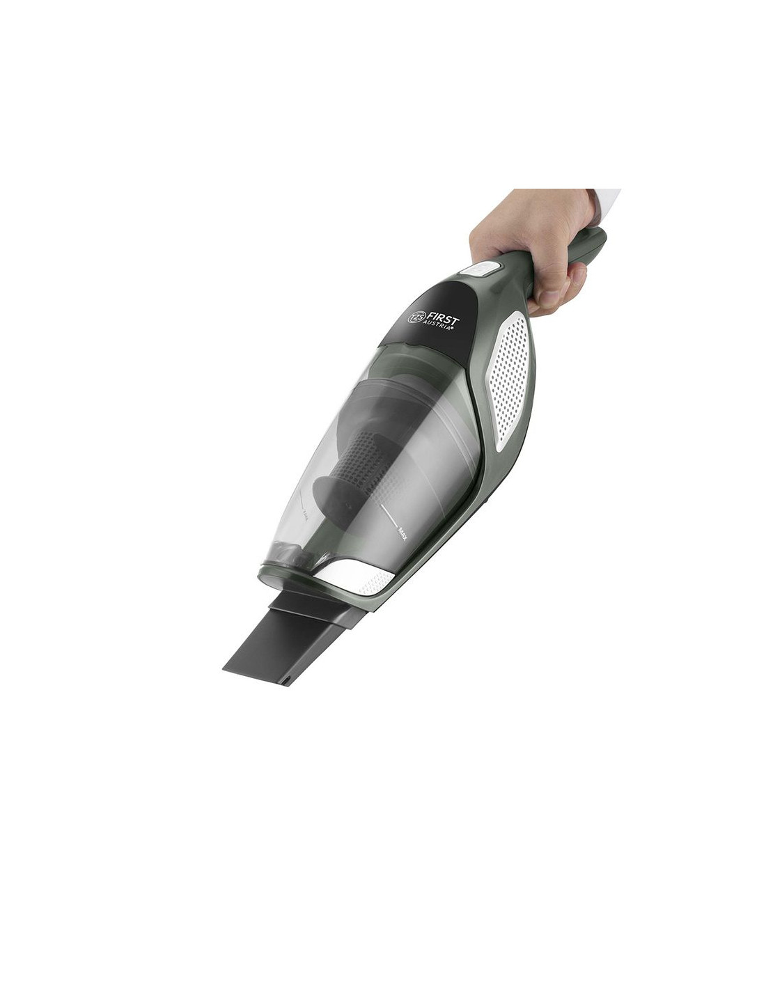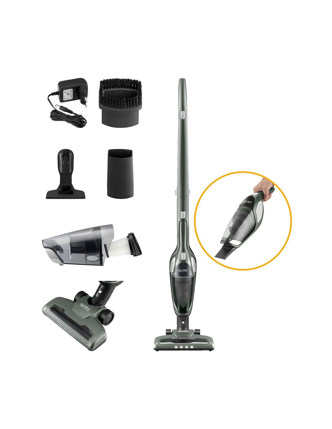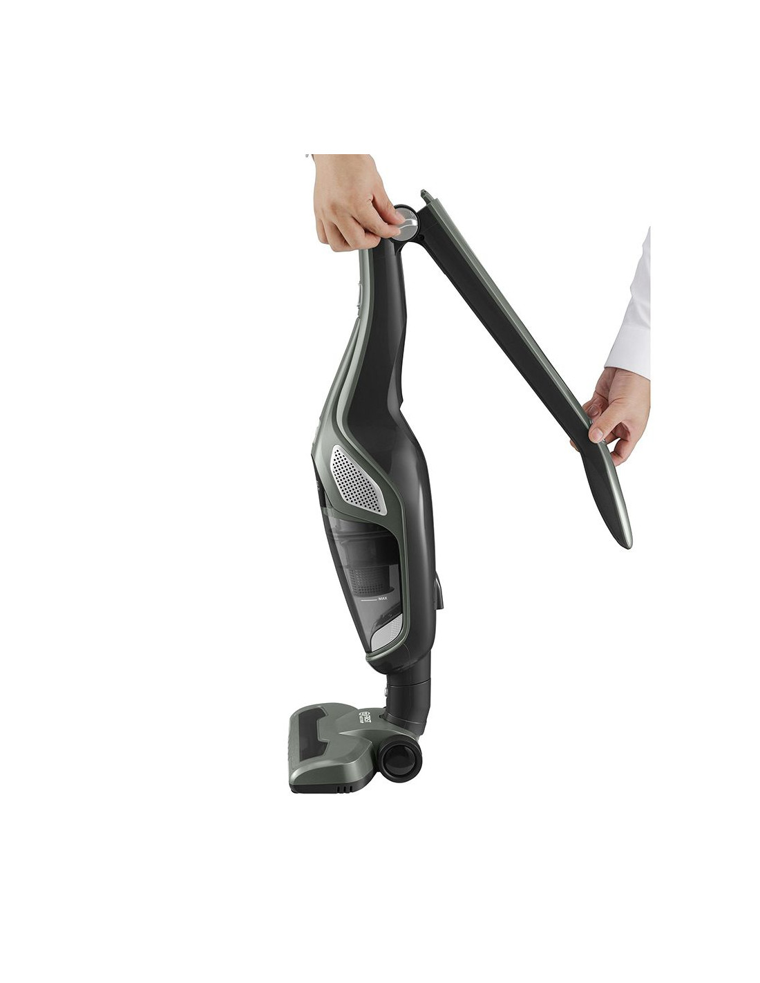 2 в 1 безкабелна акумулаторна . Система с циклонен филтър . Вместимост на контейнера за прах 0,55 л . Телескопичен дизайн с височина до 75 cm (за съхранение) и до 117 cm (за работа) . Моторизирана четка за под с LED осветление . 2 нива на смукателна мощност . LED индикатор за заряд на батерията . Филтри на отворите за входящ и изходящ въздух (HEPA/дунапрен) . Литиево-йонна батерия (22,2 V/2200 mAh) . Време на работа от 22 до 60 минути (висока/ ниска мощност) . Време за зареждане 4-6 часа . "Принадлежности: станция за паркиране и зареждане, накрайник за тесни пространства, накрайник с четка, AC/DC адаптер за захранване . Ниво на шума < 78 dB(A) . 100-240 V 50/60 Hz . Мощност 120 W
