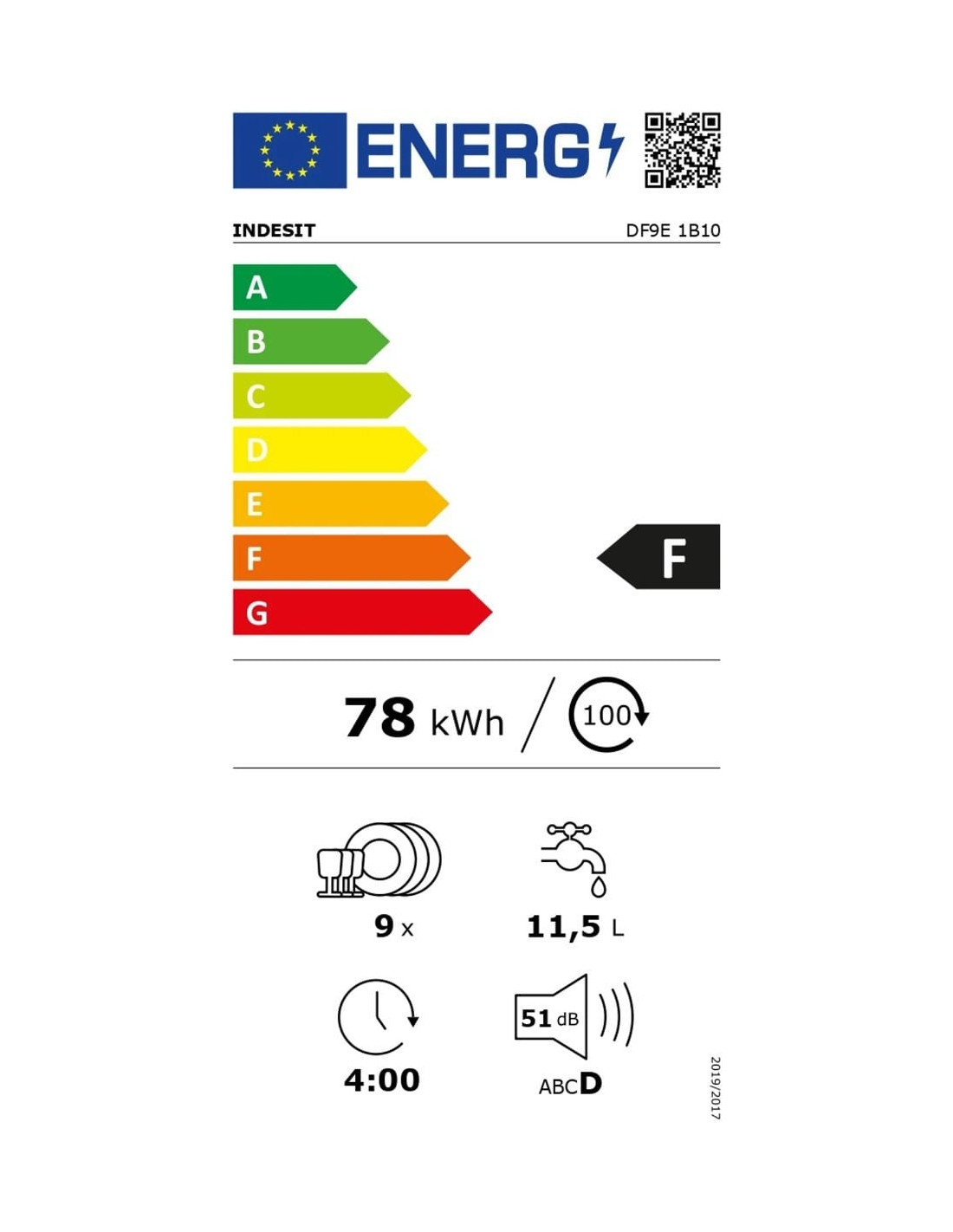 Максимален брой комплекти 9 . Предварително измиване . Половин зареждане . Интензивна 65°. Бърза. Еко . Клас на енергийна ефективност F . Потребление на енергия за 100 цикъла Еко програма 78 . Ефективност на почистване/сушене A . Консумацията на вода на цикъл Еко 11.5 л . Максимална температура за подаване на вода 60°C . Шумови въздушни емисии 51 dB . Регулируеми горно чекмедже и крачета . Размери (ВхШхД): 85 х 45 х 59 см . Цвят Бял