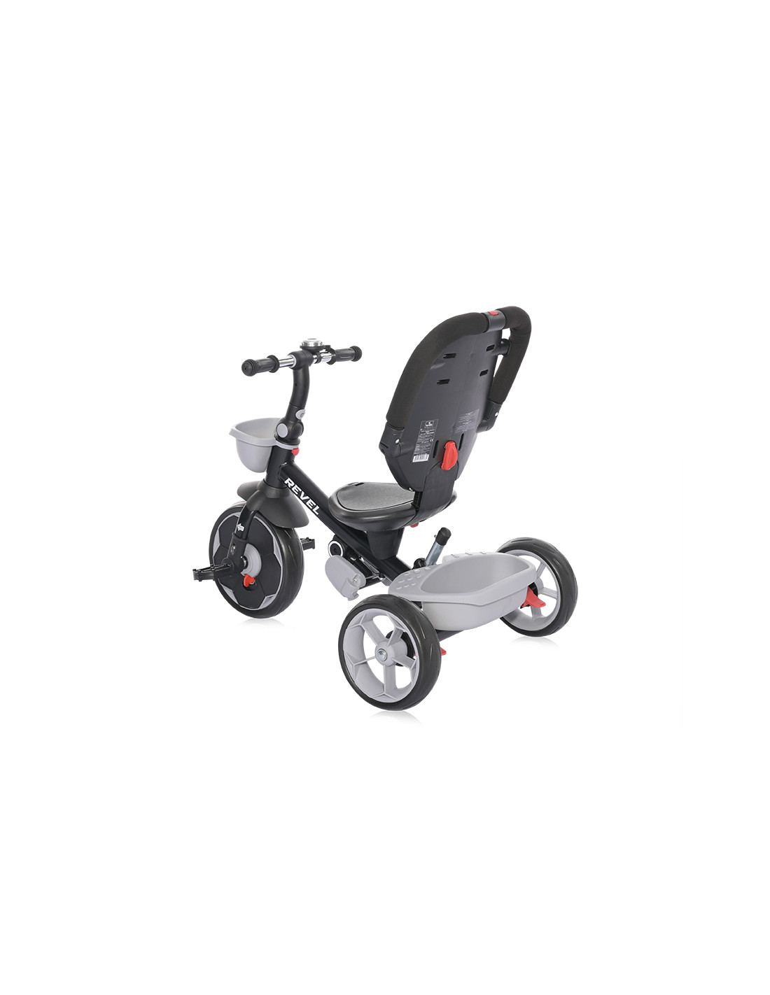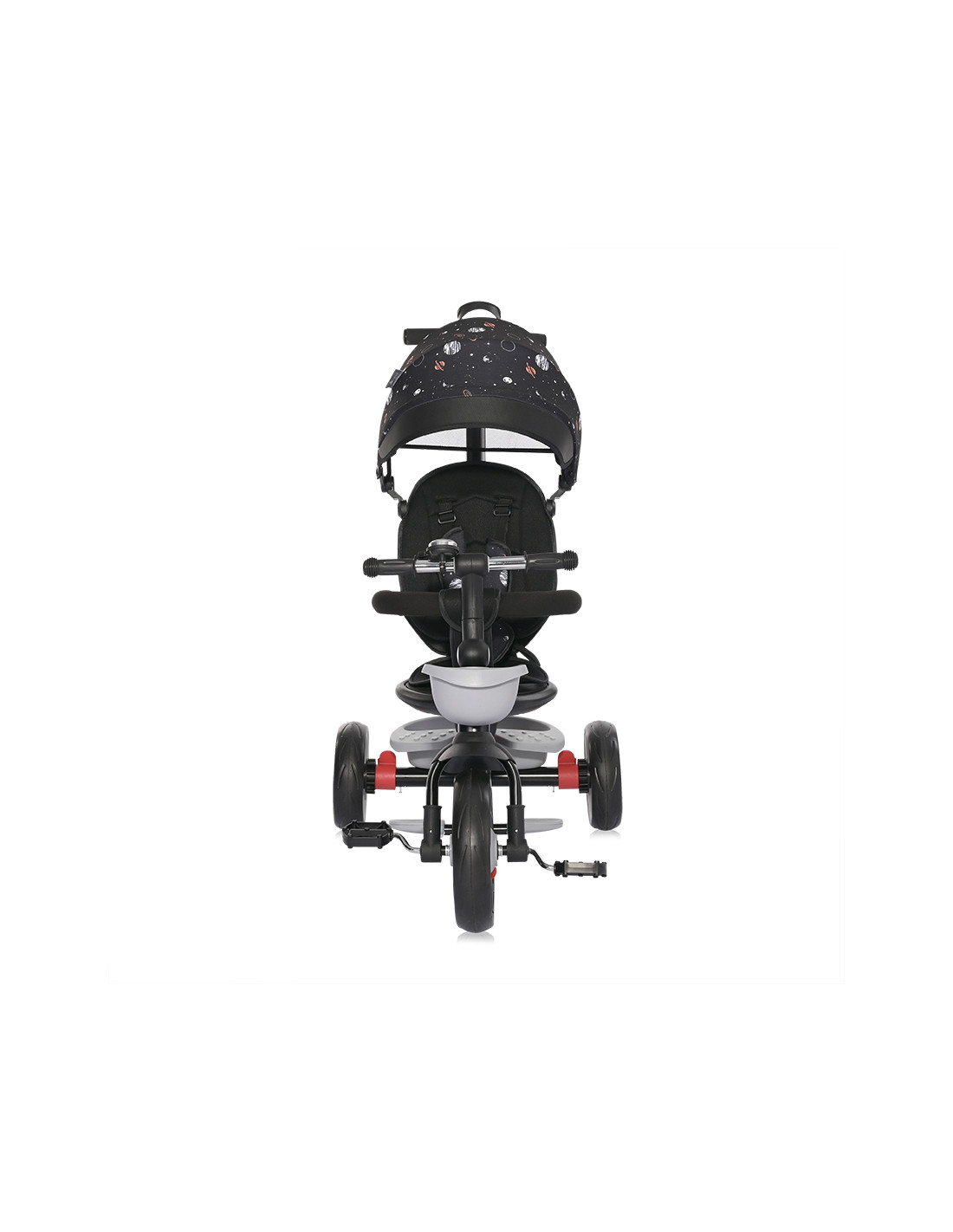 сгъваем сенник,звънец,мека седалка,спирачки на задните колела,тапицирана облегалка,педали,сгъваема поставка за крачета,бутон за завъртане на седалката,позиция: с гръб към родителя,позиция: с лице към родителя,позиция: родителски контрол,пластмасова поставка за чаша или шише,пластмасов багажник,2 позиции за регулация на височината на дръжката за родителски контрол,отстраняема тапицерия за лесно почистване,триколка - колело,въртяща се седалка за комуникиране с родителя “лицe в лице” - 360° ротация,предно кошче за поставяне на бутилка,отстраняем гриф,вкл./изкл. на механизма за свободно движение,EVA гуми,дъждобран за триколка /не е включен/,Сгъване на кормилото,Сгъваема седалка,максимално тегло 25 кг.,Предна гума: 11 инча,Задни гуми: 9 инча///