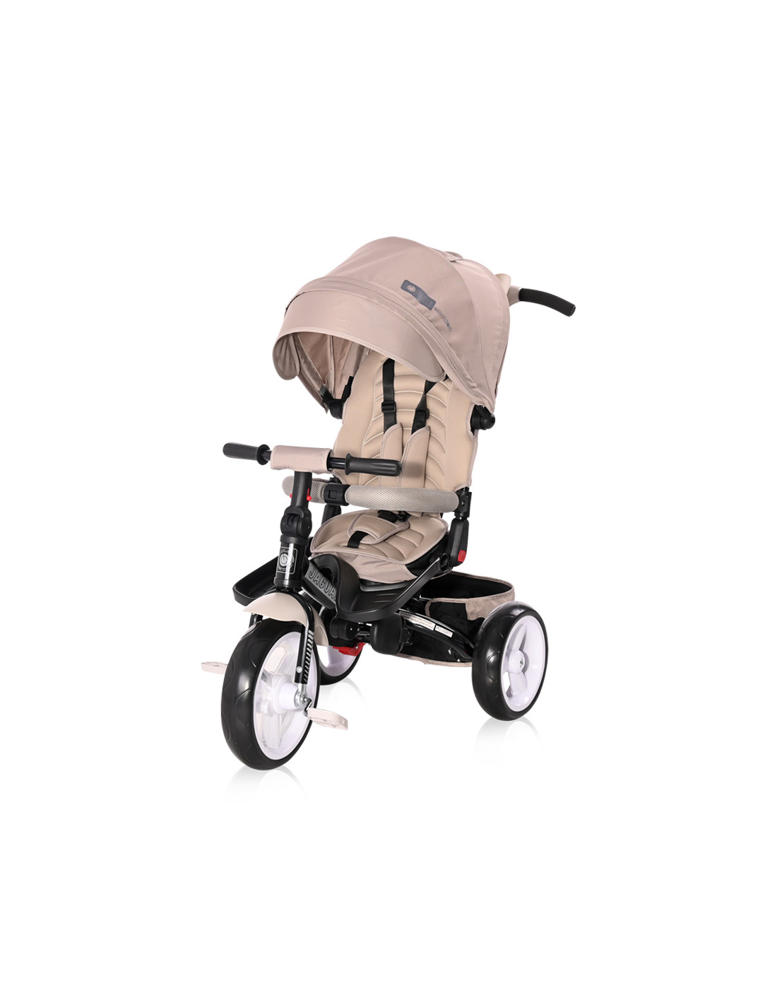 сгъваем сенник,прозорче на сенника,багажник,регулируема и комфортна облегалка,отстраняем гриф,сгъваема поставка за крачета,бутон за стопиране движението на педалите на предното колело,поставка за крачета за по-малки деца,бутон за завъртане на седалката,позиция: с гръб към родителя,позиция: с лице към родителя,позиция: родителски контрол,триколка,пластмасова поставка за чаша или шише,предпазни колани,Бутон за регулация на кормилото,Цип на сенника за отстраняване на козирката,Индивидуални спирачки на задните колела,2 позиции за регулация на височината на дръжката за родителски контрол,Скрит вътрешен механизъм за родителски контрол на предното колело,органайзер с джобове на гърба,изцяло премахваща се тапицерия за лесно почистване,дъждобран за триколка /не е включен////