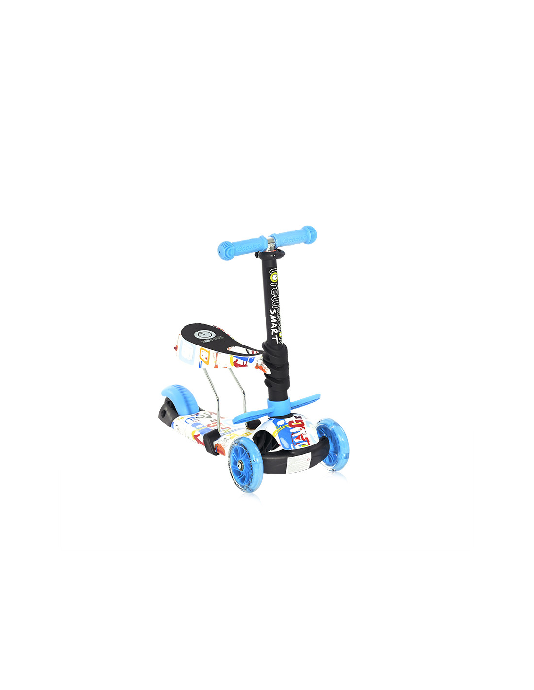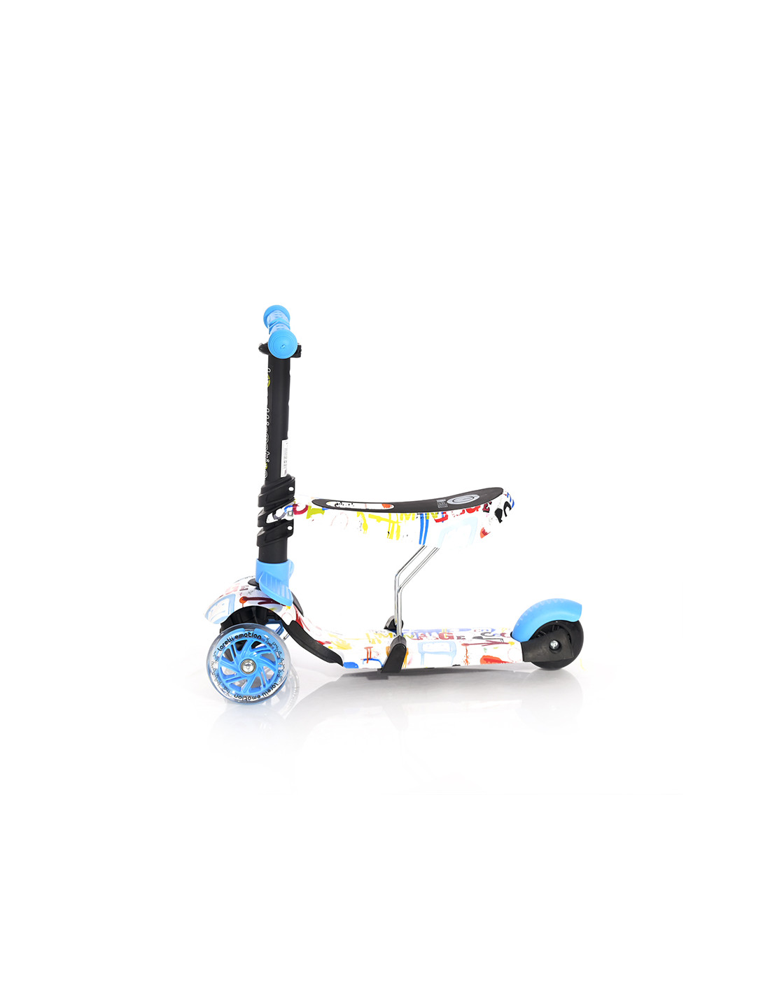 крачна спирачка,висококачествени лагери ABEC-7,TPR ръкохватки,предни полиуретанови гуми със светлина 120/28 mm,максимално тегло - 20 kg,полипропиленова платформа с размер: 350/120 mm,заднa pvc гумa 100/48 мм,сгънато положение,цветна кутия,стъпенка,седалка,регулируема дръжка в 3 позиции,Светещи гуми///