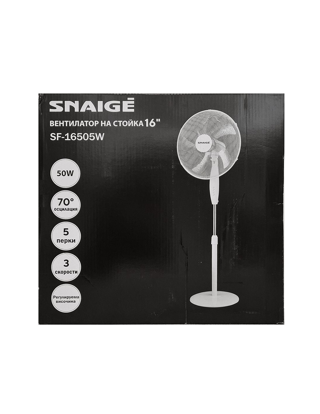 Вентилатор на стойка 16" . 3 скорости на работа . 5 PP перки . 70 градуса осцилация . Регулируема височина . Плетена решетка . Нова стабилна стойка . Мощност 50 W . Захранване 220V / 50Hz . Цвят бял