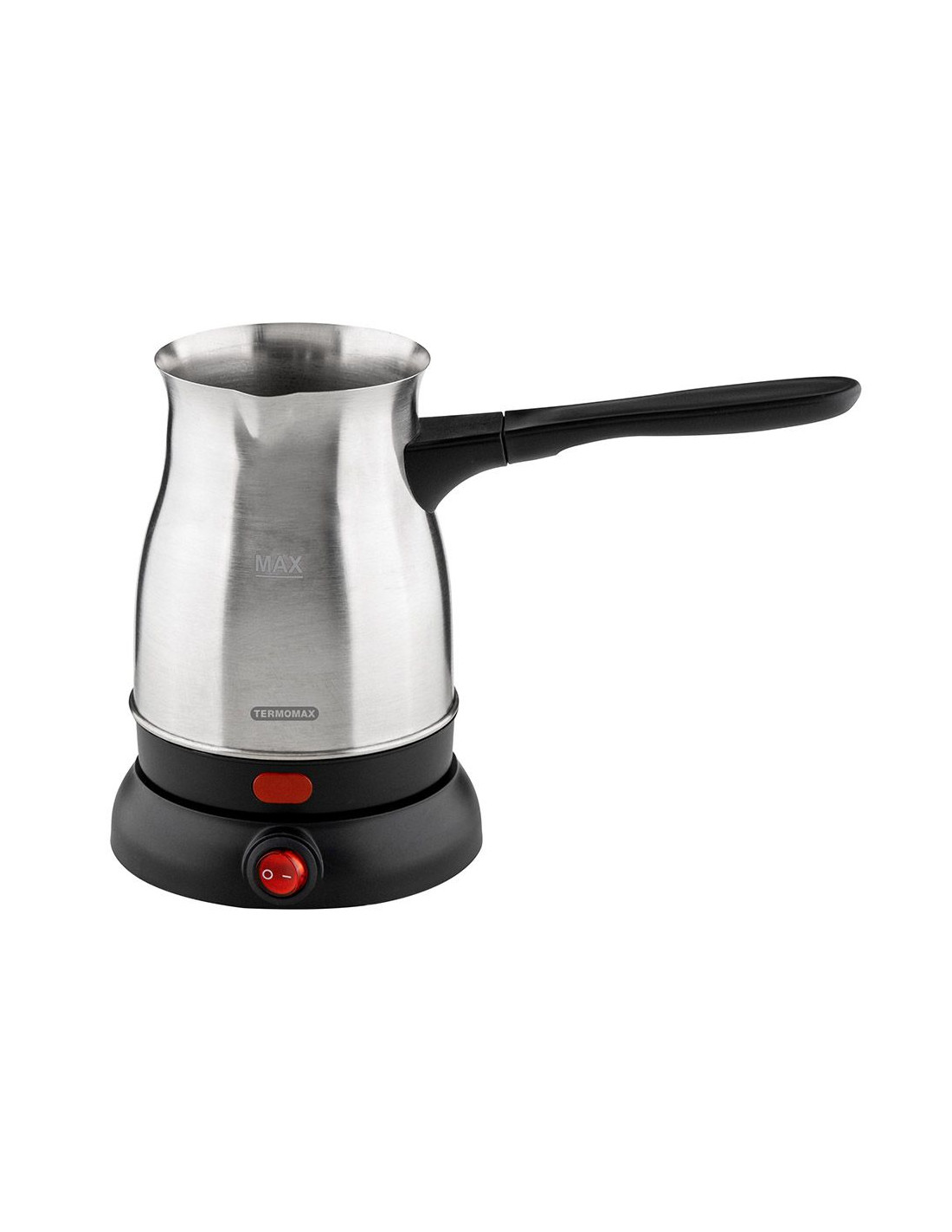 Нагревател от неръждаема стомана . Корпус от неръждаема стомана . Ключ за включване и изключване . Светлинен индикатор за работа . Общ / полезен обем: 700 / 500 мл . Въртяща се на 360° основа с кабел . Скрит нагревател . Подходящо за турско кафе и топла вода . Мощност 600 W . Захранване 220V-240V/ 50-60Hz